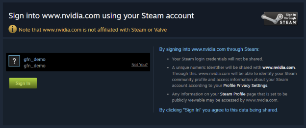 A web browser will launch, and you will connect to Steam followed by a prompt to “Sign into www.nvidia.com using your Steam account.”.